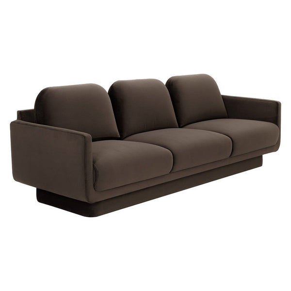 - This sofa is fully upholstered in smooth meg dark brown fabric for an inviting design that will captivate in any setting.